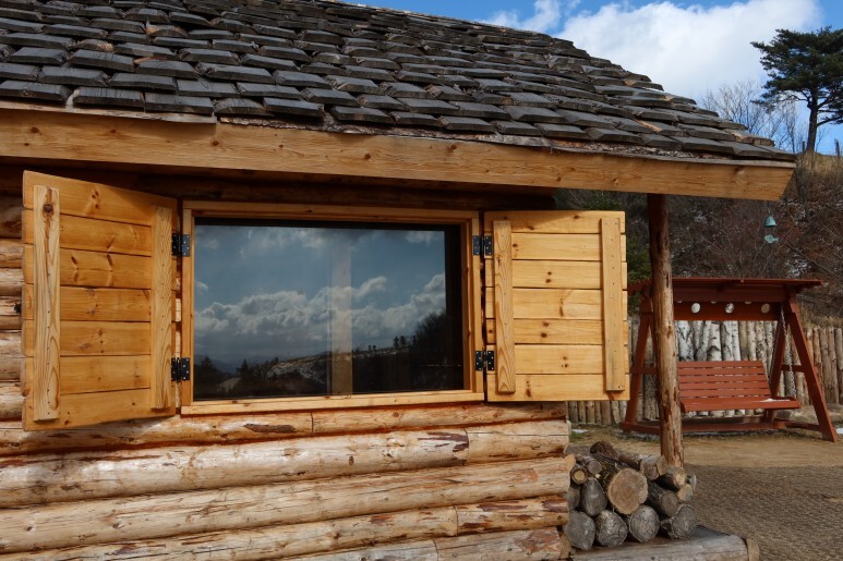 광장 뒷쪽으로 가면 카페와 통나무 집이 있습니다.